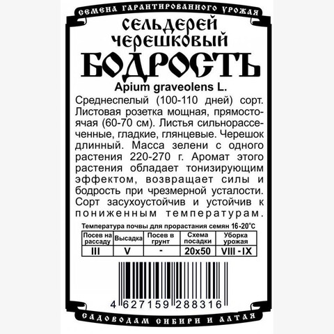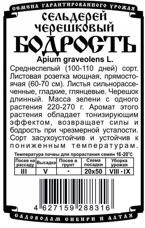 Среднеспелый (100-110 дней) сорт. Листовая розетка мощная, прямостоячая (60-70 см). Листья сильнорассеченные, гладкие, глянцевые. Черешок длинный. Масса зелени с одного растения 220-270 г. Аромат этого растения обладает тонизирующим эффектом, возвращает силы и бодрость при чрезмерной усталости. Сорт засухоустойчив и устойчив к пониженным температурам