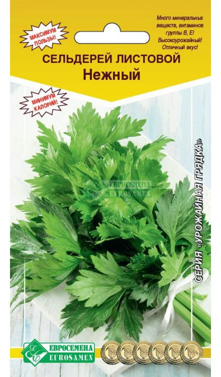 Сельдерей — это зеленое овощное растение, обладающее множеством полезных для здоровья свойств и широко используемое в кулинарии. Кроме того, в сельдерее — очень мало калорий, поэтому он просто незаменим для тех, кто на диете. Сельдерей – ценная пряность! Рекомендуется для садово-огородных участков с целью использования в свежем виде, сушке и домашней кулинарии. Нежный- среднеспелый листовой сорт, период от всходов до первого сбора 100-105 дней. Образует большое количество нежных листьев с черешками, используемых для приправы. Лист темно-зеленый, средней длины. Черешок зеленого цвета, средней длины. Зелень сельдерея срезают при длине 30см 2-3 раза за сезон. Ценится за высокую урожайность и ароматичность зелени. Применяется при сердечно - сосудистых расстройствах, анемии, заболеваниях почек и печени.