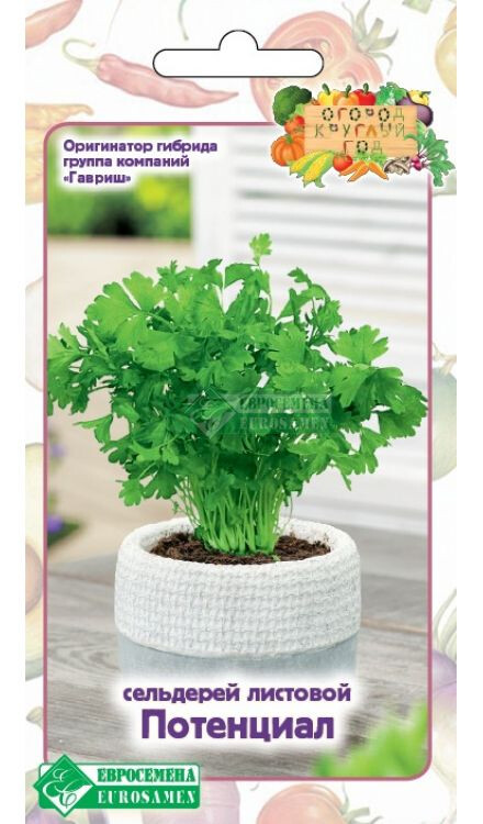 Каждая хозяйка хотела бы иметь свежую зелень в любое время года. Имея дачу или собственный огород можно баловать семью витаминными салатами на протяжении весенне-летнего периода. В зимнее же время нехватка витаминов и питательных веществ чувствуется особенно остро, поэтому все большей популярностью пользуются домашние мини-огороды на подоконниках и лоджиях, где любители земледелия умудряются вырастить почти весь дачный ассортимент овощей. Огород круглый год - модный тренд, занятие приятное и полезное, всегда под рукой пряная зелень к столу — и не нужно задумываться, как сохранить ее в свежем виде. Эта неторопливая работа по уходу за мини-огородом успокаивает, отвлекает от суеты и хлопот, к тому же растения создают особый микроклимат в помещениях, увлажняя сухой воздух и очищая его. Потенциал- cреднеспелый (95 дней) сорт сельдерея с приподнятой розеткой листьев, высотой 40 см, диаметром 25 см. Длина листовой пластинки 29 см, ширина 18 см. Черешки, длиной 24 см, шириной 0,9 см, узкие, без антоциана. Масса одного растения 180-220 г. Урожайный, с отличными товарными качествами.