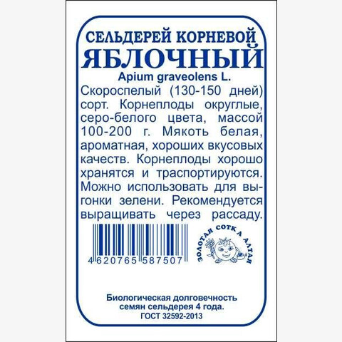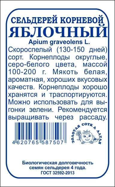 Сорт скороспелый. Корнеплоды серо-белые, округлые, массой 100-200 г, хорошо хранятся и транспортируются. Мякоть беловатая, нежная, сочная и ароматная, хорошего вкуса. В пищу используют как корнеплод, так и листья. Сельдерей повышает общий тонус организма, улучшает водно-солевой обмен и оказывает положительное действие при ожирении и неврозах.