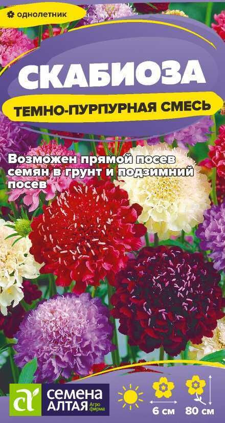 Однолетнее высокорослое растение семейства Ворсянковые с плотными душистыми соцветиями. Стебель прямой, разветвляющийся, высотой до 80 см. Прикорневые листья ланцетно-овальные крупнозубчатые, стеблевые – супротивные перисто-раздельные. Мелкие цветки собраны в головчатые соцветия диаметром 5-6 см. Соцветия разнообразных оттенков махровые, на длинных прочных цветоносах, что особенно ценно для цветочных аранжировок. Идеально подходит для декорирования клумб, рабаток, в срезке сохраняет декоративность до 20 дней. Неприхотливое светолюбивое растение, легко переносит холод и засуху. Предпочитает открытые солнечные участки на плодородных легких, хорошо удобренных перегноем рыхлых почвах. Не выносит кислых почв и переизбытка влаги. Посевы на рассаду проводят в конце февраля – начале марта. Контейнер с дренажными отверстиями наполняют рыхлым питательным субстратом. Семена аккуратно распределяют по поверхности и слегка присыпают грунтом (0,5 см), посевы увлажняют из распылителя и накрывают прозрачной пленкой. Емкость помещают в место с рассеянным освещением и температурой воздуха около +15°C, ежедневно пленку снимают для проветривания, при необходимости проводят увлажнение почвы опрыскиванием. После появления всходов пленку убирают. С появлением 2-3-х настоящих листочков сеянцы пикируют в отдельные горшочки. Высадка рассады в открытый грунт – в конце апреля – мае, посадочный интервал 25-35 см. Перед высадкой растения закаливают, вынося ежедневно на 1 час на открытый воздух. Возможен посев семян в открытый грунт в начале мая или под зиму, глубина заделки 1-1,5 см. Для весеннего посева семенам необходима стратификация, их помещают в холодильник на 2-3 месяца в отсек для овощей. Перед посадкой желательно замочить в теплой воде на сутки для лучшей всхожести. Продолжительность цветения с июля по октябрь.