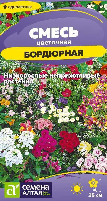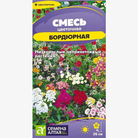 Гармонично подобранная смесь из низкорослых (до 25 см) красивоцветущих однолетников. В состав входят: календула лекарственная, каллистефус, диморфотека выемчатая, эшшольция калифорнийская, гайллардия красивая, гелиптерум розовый, иберис зонтичный, лён крупноцветковый, немофила Менциса и др. Применяется для оформления бордюров, клумб, рабаток, для устройства разграничительных линий вдоль дорожек и аллей. Растения неприхотливые, нетребовательны в уходе. Предпочитают открытые солнечные участки на любых питательных почвах, переносят полутень. Семена высевают в открытый грунт в конце апреля-начале мая, их равномерно распределяют по поверхности грунта и слегка заделывают. Первые всходы появятся через 2 недели. Когда молодые всходы окрепнут, их нужно проредить так, чтобы между растениями был интервал 15-20 см. Поливать умеренно по мере высыхания верхнего слоя почвы. Период цветения с конца июня до конца сентября.