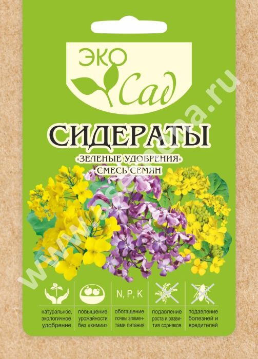 Представляет оптимально сбалансированную смесь из самых эффективных сидератных культур, позволяющих значительно увеличить плодородие почв. Состав: горчица, рапс, редька. Не высевать в качестве предшественника крестоцветных культур: капуста, репа и др.