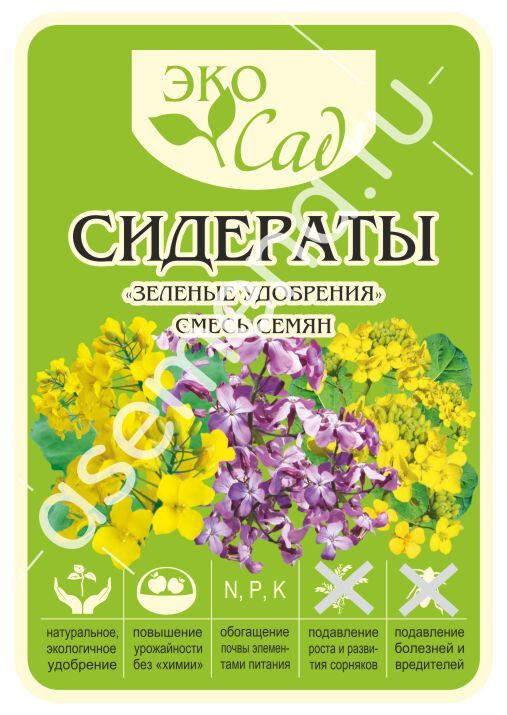 • Представляет оптимально сбалансированную смесь из самых эффективных сидератных культур, позволяющих значительно увеличить плодородие почв. Состав: горчица, рапс, редька. Не высевать в качестве предшественника крестоцветных культур: капуста, репа и др.
