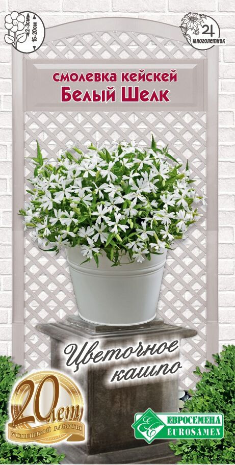 Смолевка Белый Шелк (серия Silky) - изысканный многолетник, зацветающий в год посева, образующий компактный, хорошо ветвящийся, ажурный кустик, длина побегов которого до 30 см. Это быстро растущий сорт, благодаря полуампельной шаровидной форме габитуса смолевка отлично подходит для создания бордюров, рабаток, каменистых садов и ковровых посадок. В подвесных корзинах, балконных ящиках, смешанных контейнерах и кашпо, альпинариях смотрится великолепно. Цветет все лето до поздней осени, покрывая нежными цветками звездчатой формы многочисленные побеги с сизовато-зеленой листвой. Цветет настолько обильно, что невозможно увидеть листву этого растения, хорошо смотрится в сочетании с синими горечавками, колокольчиками и фиалками. Это уникальный продукт, который теперь можно вырастить и из семян.