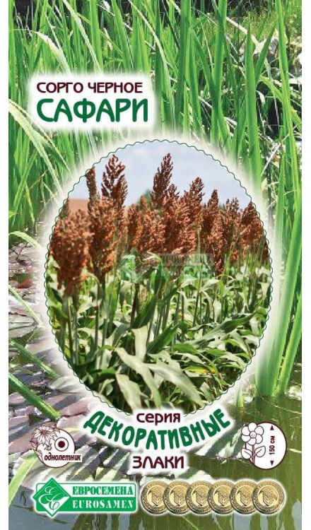 Когда мы говорим о декоративных садовых растениях, о злаках речь заходит крайне редко, а между тем, они достойны видного места в растительной композиции, и красотой могут поспорить с любыми другими обитателями сада. Хотя, декоративные злаки в последнее время обретают все большую популярность, существует более 200 различных видов, которые можно использовать в одиночных посадках или компоновать с другими растениями. Злаками украшают рокарии и альпийские горки, селят их у прудов, обрамляют ими края клумб и садовых дорожек. Сорго Сафари- растение с соцветием в виде черных колосков с коричневато-фиолетовым отливом, которые образуют довольно длинную кисточку, стебель и листья воскового типа. Спектр применения этого растения очень широкий. Великолепно выглядит с хвойниками и в групповой посадке на газоне, его применяют для составления всяческих икебан, оно прекрасно соседствует с любыми цветами, травами, овощами и помогает бороться другим культурам с полеганием, так как очень устойчиво к ветрам. Отлично выглядит сорго в больших клумбах и является эффектным одиночным растением.