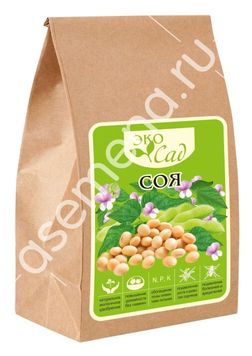 Соя обогащает землю азотом и фосфором, заменяя внесение удобрений. За сезон усваивается 150-200 кг азота на 1 гектаре. Высевают в начале мая. Глубина заделки семян – 2–4 см. Зеленую массу скашивают в фазе бутонизации и заделывают в почву на глубину 5–7 см за 2–3 недели до посева основных культур. Норма высева 1,8-2 кг на 100 м2.
