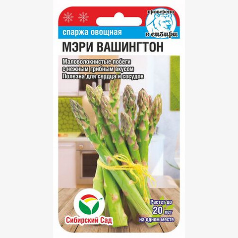 Раннеспелый многолетний сорт, растет на одном месте до 20 лет. Диетический полезный продукт для нежных гарниров, изысканных супов и салатов. Ценится за великолепный вкус и уникальное содержание витаминов и микроэлементов. Регулярное употребление спаржи способствует расширению периферических кровеносных сосудов, нормализации давления, улучшению работы сердечной мышцы, восстановлению ткани печени. Растения высотой до 1,5 м, в весенний период формируют съедобные побеги диаметром 1-1,5 см с головкой легкого красноватого оттенка. Мякоть маловолокнистая, с чрезвычайно нежной текстурой и приятным вкусом. Молодые побеги спаржи настоящая кладовая здоровья — содержат витамины: бета-каротин, рибофлавин, тиамин, ниацин, холин, аскорбиновую и фолиевую кислоты, богаты: калием, кальцием, натрием, магнием, железом, фосфором, селеном. Сорт засухо- и морозоустойчив, мало повреждается вредителями и болезнями. Выращивают семенами или делением куста в весенне-осенний период. Первый урожай собираютс 3-летних растений.