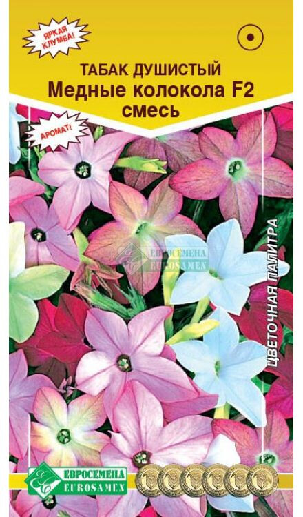 Табак душистый представляет собой травянистое многолетнее растение, принадлежащее к семейству паслёновых. Популярность у цветоводов объясняется декоративным видом разноцветных пяти лепестковых цветков и своеобразным приятным пряным запахом. Родина табака — Южноамериканский континент. О нём узнали ещё во времена экспедиций Христофора Колумба. Душистый табак пользуется спросом у многих дачников, поскольку посадка и уход не занимают много времени. Запах привлекает пчел на садовый участок, защищает некоторые растения от вредных насекомых. Медные колокола F2- удачно подобранная смесь табака крупноцветкового с незабываемыми цветами насыщенных пастельных тонов, которыми можно наслаждаться до осени. Благодаря своей неприхотливости и низкорослости, замечательно растет в вазонах, контейнерах, балконных ящиках, бордюрах. Прекрасно держит форму, переносит понижение температуры без ущерба для красоты своих соцветий. Высота растения-30 см