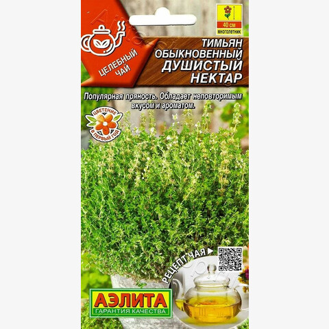 Пряно-ароматическое и эфиро-масличное растение. Обладает мощным дезинфицирующим эффектом. Многолетний полукустарник высотой 20-40 см. Растения светолюбивые, засухоустой чивые, зацветают в июле. В это же время начинают собирать побеги с цветами и листьями. Их сушат в темных проветриваемых помещениях и затем хранят в х/б мешочках. Тимьян, благодаря специфическому аромату и жгучему горьковатому вкусу, используется в кулинарии как приправа к дичи, рыбе и овощам. Отличный медонос. Чай с тимьяном – один из самых ароматных и полезных.