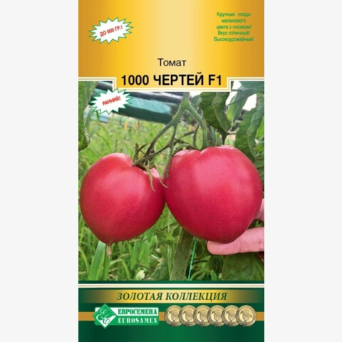 Раннеспелый (95-100 дней) продуктивный гибрид с крупными плодами розового цвета. Тысяча чертей, такого не бывает! , - первое впечатление о гибриде. Гибрид ценится за крупноплодность (до 600г), высокую урожайность, крепкий иммунитет к сложным погодным условиям. Устойчив к растрескиванию, хорошо транспортируется, отлично подходит для рынка ранней овощной продукции. Выращивается в защищенном грунте во всех регионах РФ, в южных регионах возможно выращивание в открытом грунте в коловой культуре. Растение высотой до 2м с короткими междоузлиями, ранним и частым заложением плодовых кистей. Томаты сердцевидные, розовые с красивым носиком, плотные без зеленого пятна у плодоножки, массой 350-600 г. Мякоть плотная, сочная, превосходных вкусовых качеств. Плоды салатного направления, хороши для домашнего использования и товарного рынка. Гибрид устойчив к основным заболеваниям томатов. Урожайность высокая 20-25 кг/м2.
