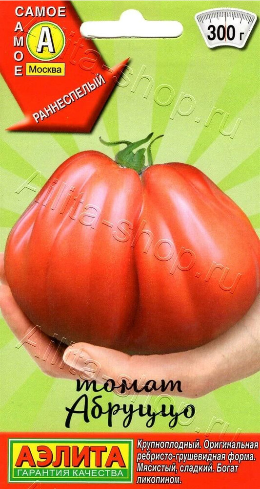 Крупноплодный сорт с оригинальной грушевидно-ребристой формой плодов. Раннеспелый, вступает в плодоношение через 105-110 дней от всходов. Растения индетерминантные, высотой 170-200 см. Плоды мясистые, увесистые, массой 220-300 г, с довольно тонкой кожицей. Мякоть плотная, малосемянная, ароматная,богатая ликопином. Вкус насыщенный, классический помидорный, с преобладанием сладости над кислинкой. Томаты идеально подходят для приготовления салатов, сока, супов, соусов. Урожайность до 7 кг с растения.