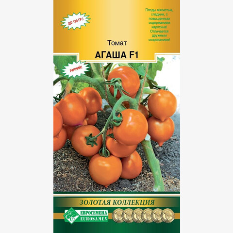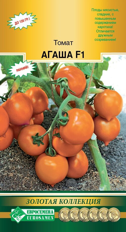 Трудно найти человека, который бы не любил томаты. Один только вид блестящих красных, оранжевых, желтых, двухцветных томатов вызывает аппетит и поднимает настроение. Помидор в переводе с итальянского языка означает золотое яблоко. С точки зрения ботаники томаты — это ягоды, но их относят к фруктам. Ведь по ботанической классификации сочные плоды с семенами внутри, развивающиеся из цветка, являются фруктами. Помидоры вкусны и полезны! Агаша- раннеспелый детерминантный гибрид томата для открытого и защищенного грунта, отличающийся дружным созреванием. С момента полных всходов до первого сбора урожая проходит 95-100 дней. Растение очень компактное, высотой 75-80 см. Первая кисть закладывается над 5-6 листом, последующие – через 1-2 листа. Соцветие простое, с 6-7 плодами средней массой 110-120 грамм. Плоды округлые, имеется небольшой носик, выровненные по форме и размеру, плотные, гладкие, тёмно-оранжевого цвета. Плоды мясистые, 3-4-камерные, сладкие, с повышенным содержанием каротина. Гибрид устойчив ко всем болезням томата. Рекомендуемая плотность посадки – 4-5 растений/м², формировка – в 2-3 стебля.