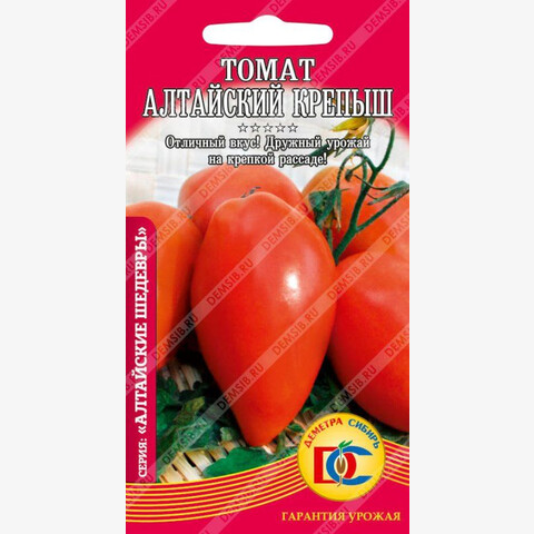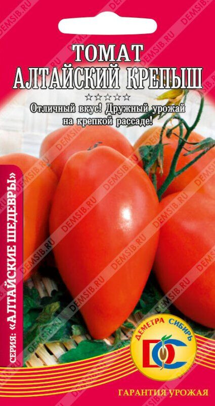 Крепкий, сильный и выносливый среднеранний детерминантный урожайный сорт, с компактным штамбовым типом куста, полностью оправдывает свое название "крепыш". Растения высотой до 60 см, почти не требуют пасынкования. Плоды красные, яркие, правильной перцевидной формы, крупные, первые длиной до 15 см и весом до 350 г, остальные помельче. Вкус и сладость мясистых плодов, даже не требующих соли при употреблении в свежем виде, можно назвать "изюминкой" данного сорта.