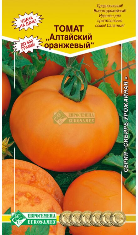 Плоды до 500 г! Среднеспелый сорт для выращивания в открытом грунте и плёночных теплицах. Период от всходов до начала созревания 110-115 дней. Растение высотой до 150 см, требует подвязки и формирования. Плод плоскоокруглый, слаборебристый, плотный, мясистый. Масса 250-350 г (до 500 г). Окраска незрелого плода – зеленая с темно-зеленым пятном у плодоножки, зрелого – ярко-оранжевая. Число гнезд более 6. Идеально подходит для приготовления соков и употребления в свежем виде. Отличается длительным периодом плодоношения, что позволяет собирать очень большие урожаи. Плоды томатов богаты витаминами, содержат фолиевую кислоту, каротин, провитамин Д и оказывают положительное воздействие на организм.