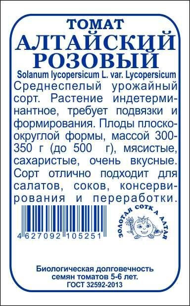 Среднеспелый урожайный сорт. Растение индетерминантное, требует подвязки и формирования. Плоды плоско-округлой формы, массой 300-350 г (до 500 г), мясистые, сахаристые, очень вкусные. Сорт отлично подходит для салатов, соков, консервирования и переработки.