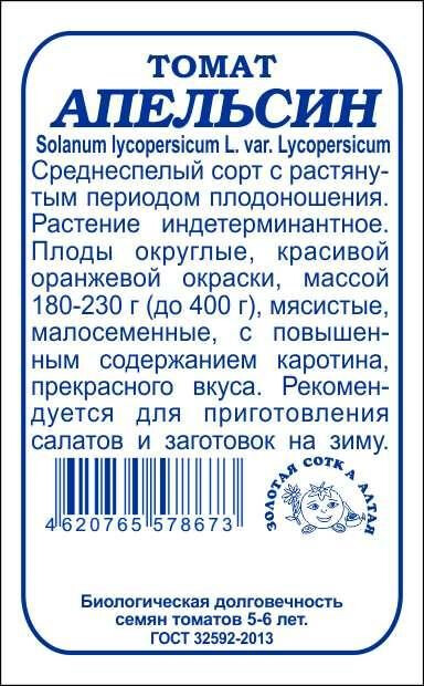 Среднеспелый крупноплодный сорт с растянутым периодом плодоношения. От массовых всходов до начала созревания 120-125 дней. Растение индетерминантное, требует подвязки и формирования. Плоды округлые, красивой оранжевой окраски, массой 200-400 г, мясистые, малосемянные, с повышенным содержанием каротина, великолепного вкуса. Сорт рекомендуется для непосредственного потребления, приготовления салатов и заготовок на зиму.