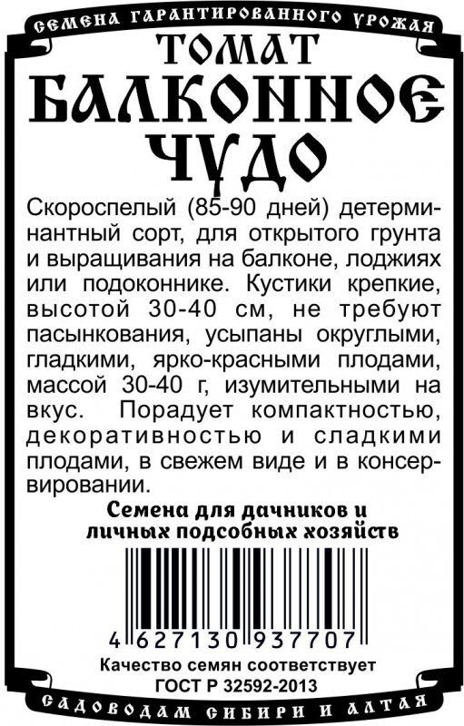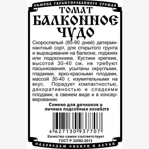 Скороспелый (85-90 дней) детерминантный сорт, для открытого грунта и выращивания на балконе, лоджиях или подоконнике. Кустики крепкие, высотой 30-40 см, не требуют пасынкования, усыпаны округлыми, гладкими, ярко-красными плодами, массой 30-40 г, изумительными на вкус. Порадует компактностью, декоративностью и сладкими плодами, в свежем виде и в консервировании.
