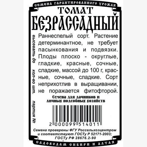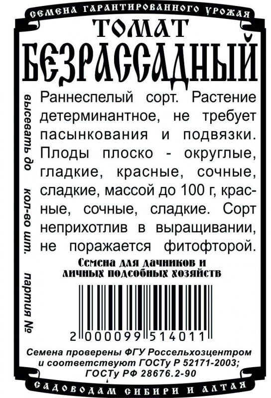 • Раннеспелый сорт. Растение детерминантное, не требует пасынкования и подвязки. Плоды плоско - округлые, гладкие, красные, сочные, сладкие, массой до 100 г . Сорт неприхотлив в выращивании, не поражается фитофторой.
