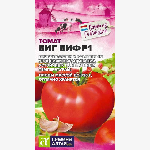 Тип Биф-томат. Раннеспелый (99 дней) высокоурожайный гибрид для выращивания в теплицах всех типов. Растение индетерминантное. Плоды плоскоокруглые, слаборебристые, мясистые, крупные, массой 210-330 г, очень вкусные и ароматные. Гибрид характеризуется хорошей лежкостью, регулярной отдачей урожая, устойчив к пониженным температурам, приспособлен к различным условиям выращивания. Место посадки: легкие плодородные нейтральные почвы. Выращивают после моркови, капусты, свеклы, бобовых и тыквенных культур Освещение: обильное, переносит легкое затенение Предпосевная подготовка: для стимулирования прорастания перед посевом семена томата замочить на 15 минут в 1% растворе марганцовки, затем промыть и подсушить Сроки посева: раннеспелые сорта высевают за 45-55 дней до высадки (март) Посев на рассаду: высевают на слегка утрамбованный грунт, мульчируют торфом или почвенным слоем 1 см, уплотняют, обильно поливают теплой водой, накрывают пленкой и ставят в теплое (около 25°С) место. После появления всходов пленку снимают, рассаду размещают в светлом месте. В течение 5-7 суток температуру поддерживают на уровне 15-16°С, затем повышают до 20-22°С Посев в грунт: не предусмотрено для большинства регионов Пикировка/перевалка: в фазе 1-2 настоящих листьев рассаду пикируют. В фазе 9-10 настоящих листьев высаживают в защищенный или открытый грунт с соблюдением посадочного расстояния 40х40 см Уход: индетерминантные томаты формируют в 1-2 стебля, удаляя пасынки. При достижении растениями верха теплицы или формировании 6-7 кистей основной стебель прищипывается. В период налива плодов рекомендуется произвести калийную подкормку Сбор урожая: собирают в течение сезона по мере созревания. Недозревшие плоды в фазе бланжевой и молочной спелости могут дозариваться не на растении