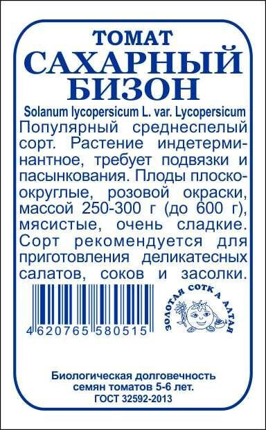 • Среднеспелый крупноплодный сорт для выращивания в открытом грунте и под плёночными укрытиями. Растение индетерминантное, требует подвязки и формирования. Плоды розовые, плоскоокруглой формы, ребристые, мясистые, массой 250-300 г (до 600 г). Мякоть плотная, сочная, сладкая, великолепного вкуса. Сорт прекрасно подходит для приготовления салатов, соков, непосредственного потребления, засолки и переработки на томатопродукты. Устойчив к неблагоприятным погодным условиям.