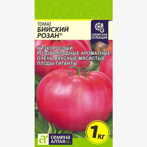 Селекция Агрофирмы Семена Алтая. Среднеранний (105-109 дней) сорт. Растение детерминантное, высотой 55-75 см. Плоды плоскоокруглые, розовые, мясистые, массой 250-600 г, отдельные плоды до 1кг! Плоды потрясающе вкусные - сладкие, сочные, с малым количеством семян и великолепным ароматом. Выращивать в открытом грунте и под пленочным укрытием. Место посадки: легкие плодородные нейтральные почвы. Выращивают после моркови, капусты, свеклы, бобовых и тыквенных культур Освещение: обильное, переносит легкое затенение Предпосевная подготовка: для стимулирования прорастания перед посевом семена томата замочить на 15 минут в 1% растворе марганцовки, затем промыть и подсушить Сроки посева: раннеспелые сорта высевают за 45-55 дней до высадки (март) Посев на рассаду: высевают на слегка утрамбованный грунт, мульчируют торфом или почвенным слоем 1 см, уплотняют, обильно поливают теплой водой, накрывают пленкой и ставят в теплое (около 25°С) место. После появления всходов пленку снимают, рассаду размещают в светлом месте. В течение 5-7 суток температуру поддерживают на уровне 15-16°С, затем повышают до 20-22°С Посев в грунт: не предусмотрено для большинства регионов Пикировка/перевалка: в фазе 2 настоящих листьев рассаду пикируют. В фазе 8-9 настоящих листьев высаживают в защищенный или открытый грунт с соблюдением минимального посадочного расстояния 40х40 см Уход: детерминантные томаты выращивают с формировкой в 3-4 стебля или без формировки. В период налива плодов рекомендуется произвести калийную подкормку Сбор урожая: собирают в течение сезона по мере созревания. Недозревшие плоды в фазе молочной спелости могут дозариваться не на растении