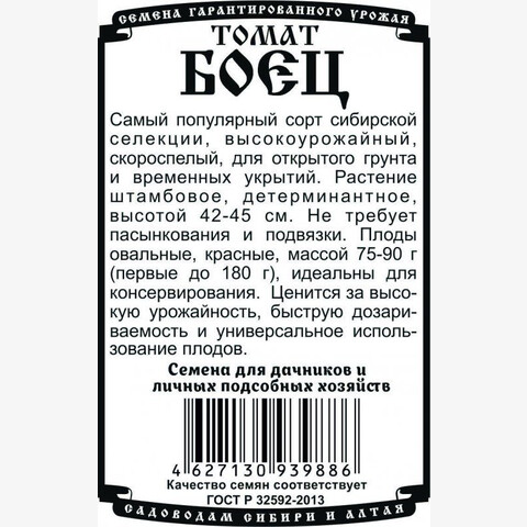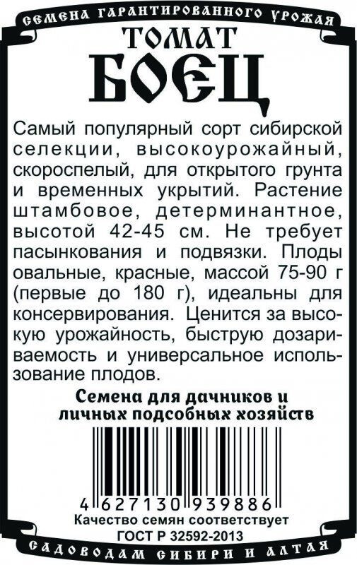 Самый популярный сорт сибирской селекции, высокоурожайный, скороспелый, для открытого грунта и временных укрытий. Растение штамбовое, детерминантное, высотой 42-45 см. Не требует пасынкования и подвязки. Плоды овальные, красные, массой 75-90 гр (первые до 180 гр), идеальны для консервирования. Ценится за высокую урожайность, быструю дозариваемость и универсальное использование плодов.