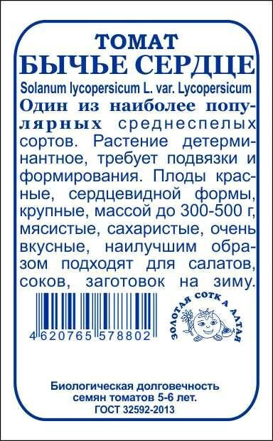 Один из наиболее популярных среднеспелых сортов. Растение детерминантное, требует подвязки и формирования. Плоды красные, сердцевидной формы, крупные, массой до 300-500 г, мясистые, сахаристые, очень вкусные. Сорт используется для приготовления салатов и соков, подходит для переработки и консервирования.