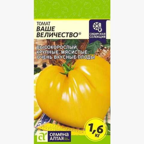 Селекция Агрофирмы Семена Алтая. Среднеспелый индетерминантый сорт. Растение высотой 110-190 см. Плоды очень крупные, мясистые, малосемянные, массой 350-500 г (отдельные до 1600 г), желтые, красивой сердцевидной формы. Великолепен в салатах и заготовках на зиму благодаря отличным вкусовым качествам. Место посадки: легкие плодородные нейтральные почвы. Выращивают после моркови, капусты, свеклы, бобовых и тыквенных культур Освещение: обильное, переносит легкое затенение Предпосевная подготовка: для стимулирования прорастания перед посевом семена томата замочить на 15 минут в 1% растворе марганцовки, затем промыть и подсушить Сроки посева: среднеспелые сорта высевают за 60-70 дней до высадки (март) Посев на рассаду: высевают на слегка утрамбованный грунт, мульчируют торфом или почвенным слоем 1 см, уплотняют, обильно поливают теплой водой, накрывают пленкой и ставят в теплое (около 25°С) место. После появления всходов пленку снимают, рассаду размещают в светлом месте. В течение 5-7 суток температуру поддерживают на уровне 15-16°С, затем повышают до 20-22°С Посев в грунт: не предусмотрено для большинства регионов Пикировка/перевалка: в фазе 1-2 настоящих листьев рассаду пикируют. В фазе 9-10 настоящих листьев высаживают в защищенный или открытый грунт с соблюдением посадочного расстояния 40х40 см Уход: индетерминантные томаты формируют в 1-2 стебля, удаляя пасынки. При достижении растениями верха теплицы или формировании 6-7 кистей основной стебель прищипывается. В период налива плодов рекомендуется произвести калийную подкормку Сбор урожая: собирают в течение сезона по мере созревания. Недозревшие плоды в фазе бланжевой и молочной спелости могут дозариваться не на растении