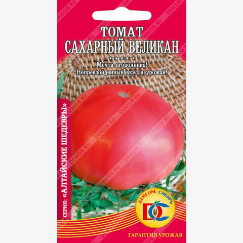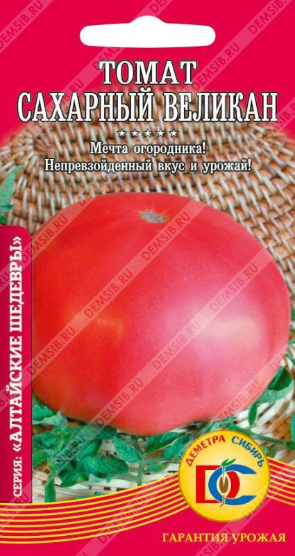 Среднеранний (110-120 дней) высокоурожайный сорт с великолепными крупными плодами. Рекомендуется для выращивания в открытом и защищенном грунте. Растение высотой до 150 см. Плоды округло-плоские, слаборебристые, малиновые, мясистые, сочные, сладкие, массой до 600 г. Рекомендуется для приготовления салатов и томатопродуктов.