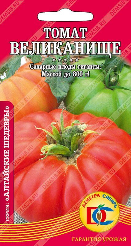 Среднеранний (110-116 дней) высокоурожайный сорт, для открытого и защищенного грунта. Растения индетерминантные, мощные, требуют формирование в 1-2 стебля. Плоды, очень крупные, ровные, округлой формы, красного цвета. В первой кисти достигают 700-800 г, в последующих 300-400 г, не растрескиваются Мякоть маслянистая, сладкая, сахаристая, очень вкусная. Сорт прекрасно подходит для детского питания, приготовления диетических, высоковитаминных салатов и соков, а также засолки и консервирования.
