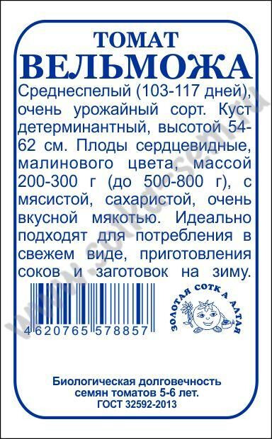 Очень урожайный среднеспе- лый сорт. От массовых всходов до начала плодоношения 103-117 дней. Куст детерминантный, высо- той 54-62 см. Плоды сердцевид- ные, малинового цвета, массой 200-300 г (до 500-800 г), с мяси- стой, сахаристой, очень вкусной мякотью. Идеально подходят для непосредственного потребления, приготовле- ния соков и салатов, заготовок на зиму.