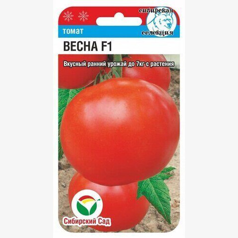 Новый ранний крупноплодный гибрид ВЕСНА F1 алтайской селекции гарантирует, что вы одними из первых будете угощаться ранними томатами со своего огорода! Гибрид предназначен для выращивания в пленочных теплицах. Растение среднерослое, со слабой побегообразовательной способностью (что значительно сокращает затраты труда на пасынкование). В кисти образуется до 5-7 крупных светло-красных плодов массой 200 - 300 грамм. Томаты очень выровненные, гладкие, плотные и блестящие, словом, по отточенности форм обладают истинно голландской красотой. Вкусовые же качества гибрида можно назвать чисто русскими. Плоды не пресные, прекрасное сочетание Сахаров и кислот дает им замечательный вкус. Гибрид урожайный (до 7 кг с растения), предназначен для потребления в свежем виде и домашних заготовок.