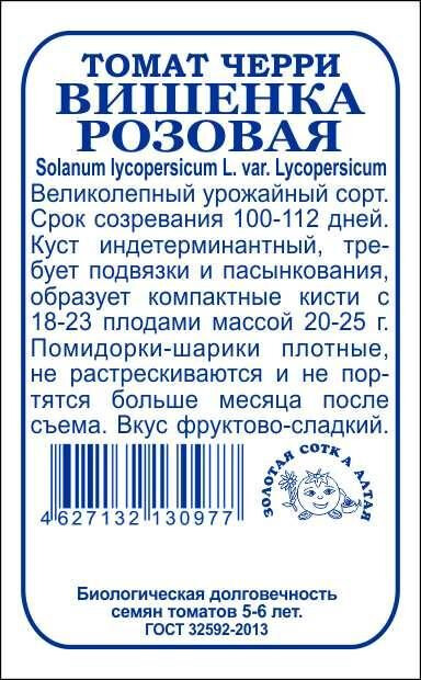 Великолепный высокоурожайный сорт томата-черри, рекомендованный для возделывания в открытом грунте, теплицах и в качестве контейнерного растения на балконах. От всходов до созревания 100-112дней. Растение индетерминантное, требует подвязки к кольям или шпалере, пасынкования и прищипки, образует компактные кисти с 18-23 плодами массой 20-25 г. Помидорки-шарики красивого малиново-розового цвета, плотные, не растрескиваются и не портятся больше месяца после съема. Вкус фруктовый, насыщенносладкий, аромат приятный, насыщенный. Сорт обладает высокой устойчивостью к фитофторозу и пониженным температурам, отличается дружным созреванием плодов, что позволяет убирать урожай целыми кистями. Используется в кулинарии и для непосредственного потребления, приготовления салатов и закусок канапе, украшения блюд и цельноплодного консервирования, в том числе ассорти.