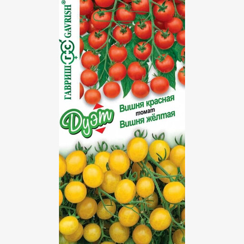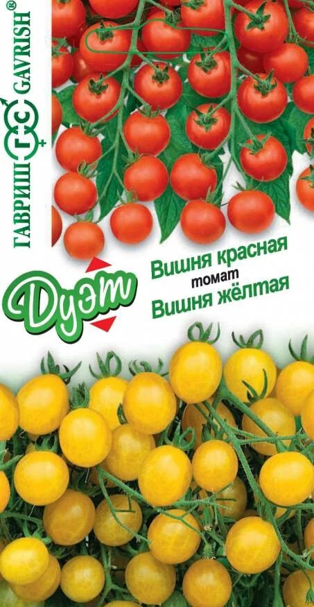 Томат Вишня красная: Скороспелый (95-100 дней) высокорослый (более 200 см) сорт для теплиц и открытого грунта (южные регионы, с подвязкой к кольям). Плоды-черри округлой формы, собраны в длинную кисть по 20-40 шт., массой 15-20 г, сочные, с медовой мякотью. Плоды созревают в кисти одновременно, придавая растению необыкновенную декоративность. Томат Вишня желтая: Раннеспелый (92-96 дней) высокорослый (более 200 см) сорт для теплиц и открытого грунта с длительным плодоношением. Черри округлой формы, желтого цвета, массой 15-20 г, очень сладкие, собраны в эффектную кисть по 20-40 плодов. Рекомендуются для фуршетных закусок, салатов, консервирования, приготовления ярких ассорти.
