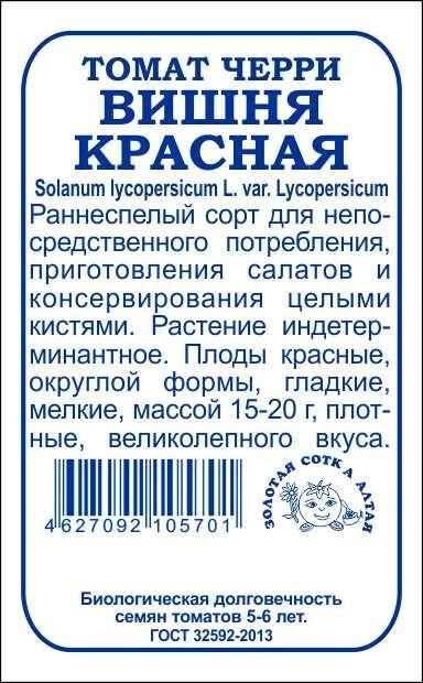 Прекрасный раннеспелый сорт со сладкими помидорками, рекомендованный для непосредственного потребления, приготовления салатов и украшения блюд, переработки и консервирования целыми кистями. Срок созревания 95-102 дня. Растение индетерминантное, полураскидистое, средневетвистое, слабооблиственное, требует подвязки к кольям, пасынкования и прищипки над 3-4 кистью. Плоды красные, округлой формы, гладкие, мелкие, массой 15-20 г, плотные, великолепного вкуса. Урожайность товарных плодов 1-2 кг с одного растения.
