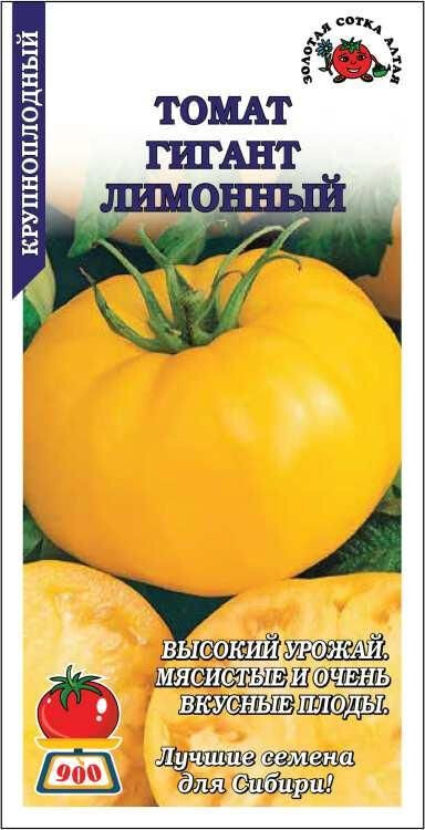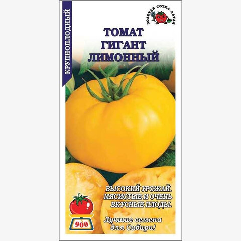 Крупноплодный урожайный сорт для открытого грунта и теплиц. Срок созревания около 120 дней. Растение индетерминантное, требует пасынкования и подвязки. Плоды красивой лимонно-желтой окраски, плоско-округлые, крупные и очень крупные, массой 350-400 г (отдельные до 900 г), сочные, мясистые и сахаристые, великолепного вкуса. Сорт рекомендуется для непосредственного потребления и приготовления салатов, консервирования и переработки.