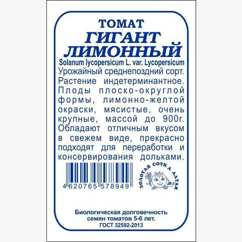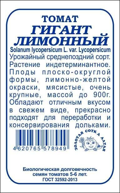 Урожайный среднепоздний сорт. Растение индетерминантное. Плоды плоско-округлой формы, лимонно-желтой окраски, мясистые, очень крупные, массой до 900г.Обладают отличным вкусом в свежем виде, прекрасно подходят для переработки и консервирования дольками.