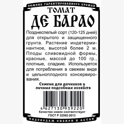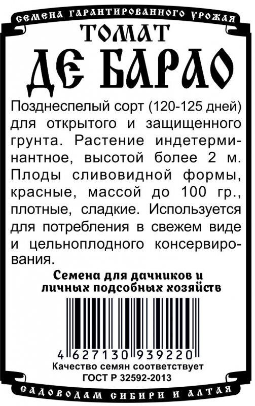 Позднеспелый сорт (120-125 дней) для открытого и защищенного грунта. Растение индетерминантное, высотой более 2м. Плоды сливовидной формы, красные, массой до 100г, плотные, сладкие. Используется для потребления в свежем виде и цельноплодного консервирования.
