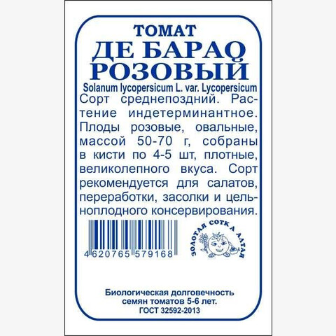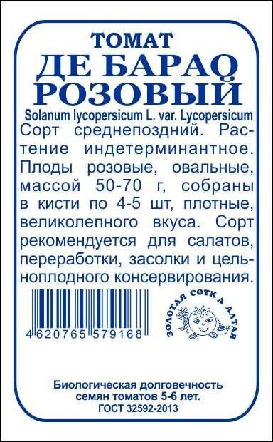Среднепоздний высокоурожайный сорт. От всходов до начала плодоношения 117-120 дней. Растение индетерминантное, требует подвязки и пасынкования. Плоды розовые, овальные, гладкие, массой 50-70 г, собраны в кисти по 4-5 шт, плотные, великолепного вкуса. Сорт рекомендуется для непосредственного потребления, приготовления салатов, переработки, засолки и цельноплодного консервирования.