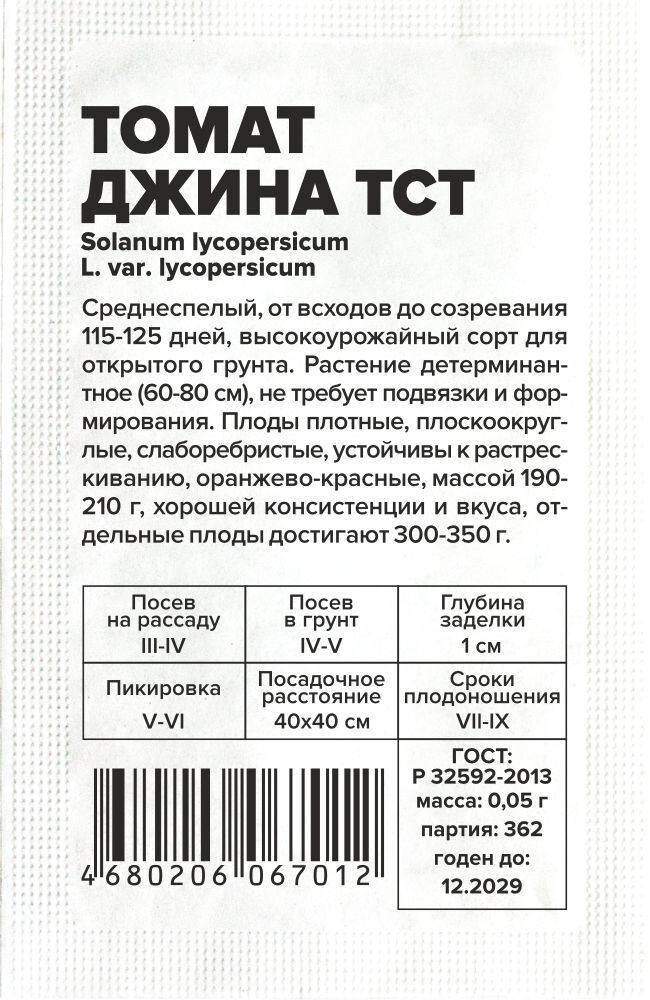 Среднеспелый, от всходов до созревания 115-125 дней, высокоурожайный сорт для открытого грунта. Растение детерминантное (60-80 см), не требует подвязки и формирования. Плоды плотные, плоскоокруглые, слаборебристые, устойчивы к растрескиванию, оранжево-красные, массой 190-210 г, хорошей консистенции и вкуса, отдельные плоды достигают 300-350 г. Сорт устойчив к вертициллезу и фузариозу. Место посадки: легкие плодородные нейтральные почвы. Выращивают после моркови, капусты, свеклы, бобовых и тыквенных культур Освещение: обильное, переносит легкое затенение Предпосевная подготовка: для стимулирования прорастания перед посевом семена томата замочить на 15 минут в 1% растворе марганцовки, затем промыть и подсушить Сроки посева: среднеспелые сорта высевают за 60-70 дней до высадки (март) Посев на рассаду: высевают на слегка утрамбованный грунт, мульчируют торфом или почвенным слоем 1 см, уплотняют, обильно поливают теплой водой, накрывают пленкой и ставят в теплое (около 25°С) место. После появления всходов пленку снимают, рассаду размещают в светлом месте. В течение 5-7 суток температуру поддерживают на уровне 15-16°С, затем повышают до 20-22°С Посев в грунт: не предусмотрено для большинства регионов Пикировка/перевалка: в фазе 2 настоящих листьев рассаду пикируют. В фазе 8-9 настоящих листьев высаживают в защищенный или открытый грунт с соблюдением минимального посадочного расстояния 40х40 см Уход: детерминантные томаты выращивают с формировкой в 3-4 стебля или без формировки. В период налива плодов рекомендуется произвести калийную подкормку Сбор урожая: собирают в течение сезона по мере созревания. Недозревшие плоды в фазе молочной спелости могут дозариваться не на растении
