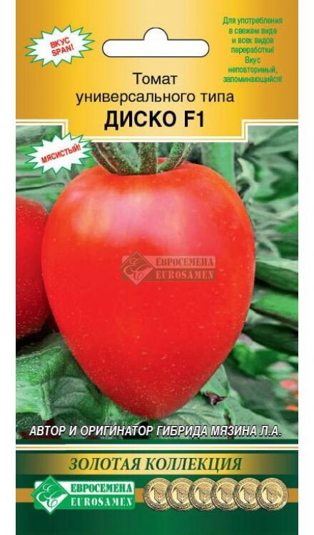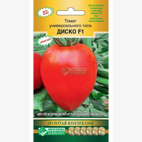 Автор и оригинатор гибрида Мязина Л.А. Для употребления в свежем виде и всех видов переработки! Вкус неповторимый, запоминающийся! Трудно найти человека, который бы не любил томаты. Один только вид блестящих красных, оранжевых, желтых, двухцветных томатов вызывает аппетит и поднимает настроение. Помидор в переводе с итальянского языка означает золотое яблоко. С точки зрения ботаники томаты — это ягоды, но их относят к фруктам. Ведь по ботанической классификации сочные плоды с семенами внутри, развивающиеся из цветка, являются фруктами. Помидоры вкусны и полезны! Диско F1 -раннеспелый (90-95 дн.) , индетерминантный гибрид первого поколения для выращивания в открытом грунте и пленочных теплицах в ЛПХ. Соцветие промежуточное. Плод плоскоокруглой формы, слегка вытянутый, крупный, содержит много ликопина. Окраска незрелого плода- зеленая с зеленым полосами, которые при созревании делают вкус плодов неповторимым и очень вкусным, зрелого - красная. Число гнезд 4-6. Масса плода - 350 г. Товарная урожайность в пленочных теплицах составила 11,0-12,0 кг/кв.м. Можно выращивать в 1-2 стебля с пасынкованием и подвязкой. В конце вегетации верхушку куста нужно обрезать, оставив над кистью 2 листа.