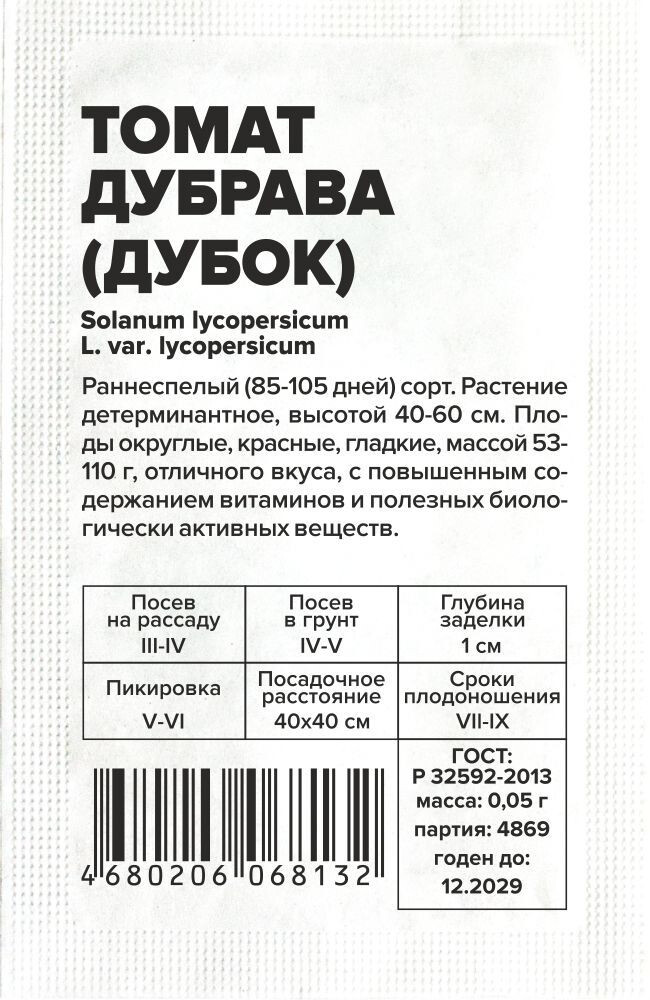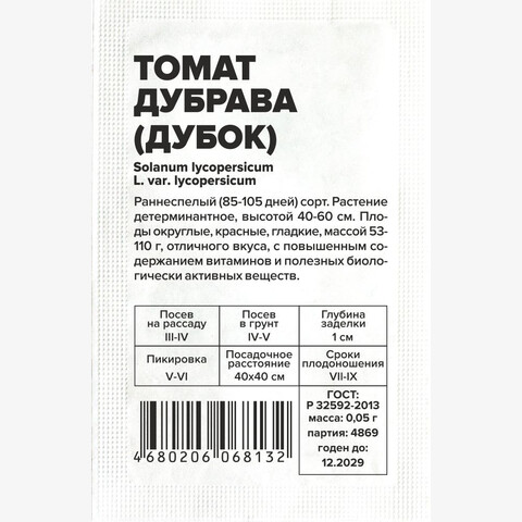Раннеспелый (85-105 дней) сорт. Растение детерминантное, высотой 40-60 см. Плоды округлые, красные, гладкие, массой 53-110 г, отличного вкуса, с повышенным содержанием витаминов и полезных биологически активных веществ. Место посадки: легкие плодородные нейтральные почвы. Выращивают после моркови, капусты, свеклы, бобовых и тыквенных культур Освещение: обильное, переносит легкое затенение Предпосевная подготовка: для стимулирования прорастания перед посевом семена томата замочить на 15 минут в 1% растворе марганцовки, затем промыть и подсушить Сроки посева: раннеспелые сорта высевают за 45-55 дней до высадки (март) Посев на рассаду: высевают на слегка утрамбованный грунт, мульчируют торфом или почвенным слоем 1 см, уплотняют, обильно поливают теплой водой, накрывают пленкой и ставят в теплое (около 25°С) место. После появления всходов пленку снимают, рассаду размещают в светлом месте. В течение 5-7 суток температуру поддерживают на уровне 15-16°С, затем повышают до 20-22°С Посев в грунт: не предусмотрено для большинства регионов Пикировка/перевалка: в фазе 2 настоящих листьев рассаду пикируют. В фазе 8-9 настоящих листьев высаживают в защищенный или открытый грунт с соблюдением минимального посадочного расстояния 40х40 см Уход: детерминантные томаты выращивают с формировкой в 3-4 стебля или без формировки. В период налива плодов рекомендуется произвести калийную подкормку Сбор урожая: собирают в течение сезона по мере созревания. Недозревшие плоды в фазе молочной спелости могут дозариваться не на растении