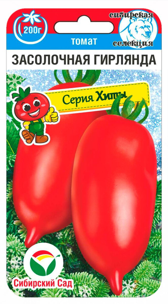 Серия "Консервация и засол" Среднеспелый суперурожайный сорт засолочно-консервного направления селекции АФ Сибирский сад. Отличается частым заложением обильных плодовых кистей, образующих сплошную плодовую гирлянду из ярко-красных блестящих томатов. Ценится за практически 100% устойчивость к основным заболеваниям томатов, приспособленность к сложным погодным условиям, высокую продуктивность и товарность плодов. Выращивается в защищенном и открытом грунте с подвязкой к шпалере. Растение индетерминантное, высотой более 2м. Первая кисть закладывается над 6-7 листом, последующие через 2-3 листа. За время вегетации растение формирует до 9 обильно нагруженных плодовых кистей с 8-10 кубовидо-удлиненными плодами, украшенных красивым носиком. Первые плоды более крупные, весом 170-200г, последующие 120-150г. Томаты глянцево-красные, без зеленого пятна у плодоножки, вкусные, плотные, не трескаются при термической обработке, хорошо хранятся и дозариваются. Прекрасно подходят для потребления в свежем виде, засолки, консервации и вяления. Потенциальная урожайность до 7кг с растения.