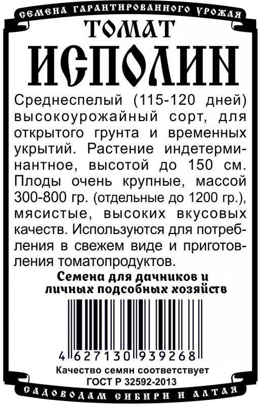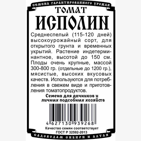 Среднеспелый (115-120 дней) высокоурожайный сорт, для открытого грунта и временных укрытий. Растение индетерминантное, высотой до 150см. Плоды очень крупные, массой 300-800г (отдельные до 1200г), мясистые, высоких вкусовых качеств. Используются для потребления в свежем виде и приготовления томатопродуктов.