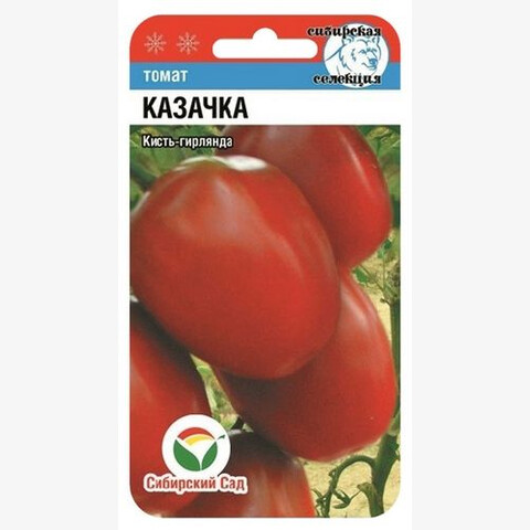 Очень красивый, обильноплодоносящий сорт среднего срока созревания. Растение индетерминантное, с крупными темно-зелеными листьями, формирует нарядные, плотные, длинные кисти, похожие на гирлянды или на девичьи косы. Кисти украшены вкусными, бочонковидными плодами темно-вишневого цвета, массой 35-50 г, долго сохраняющимися в кисти. Аккуратные, идеально выровненные, плотные томатики-бочоночки будут изысканно смотреться в банках и замечательно украсят ваш зимний стол. Как и все сорта с темной окраской плодов, КАЗАЧКА особенно полезна мужскому организму. Сорт предназначен для выращивания в остекленных и пленочных теплицах.