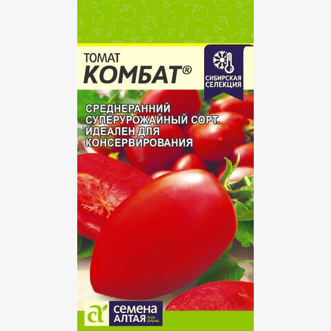 Селекция Агрофирмы Семена Алтая. Великолепный среднеранний сорт для консервирования и засолки! Растение штамбовое, детерминантное. Плод цилиндрический, гладкий, плотный, окраска зрелого плода красная, массой 95-145 г. Для выращивания в открытом грунте и под пленочными укрытиями. Место посадки: легкие плодородные нейтральные почвы. Выращивают после моркови, капусты, свеклы, бобовых и тыквенных культур Освещение: обильное, переносит легкое затенение Предпосевная подготовка: для стимулирования прорастания перед посевом семена томата замочить на 15 минут в 1% растворе марганцовки, затем промыть и подсушить Сроки посева: раннеспелые сорта высевают за 45-55 дней до высадки (март) Посев на рассаду: высевают на слегка утрамбованный грунт, мульчируют торфом или почвенным слоем 1 см, уплотняют, обильно поливают теплой водой, накрывают пленкой и ставят в теплое (около 25°С) место. После появления всходов пленку снимают, рассаду размещают в светлом месте. В течение 5-7 суток температуру поддерживают на уровне 15-16°С, затем повышают до 20-22°С Посев в грунт: не предусмотрено для большинства регионов Пикировка/перевалка: в фазе 2 настоящих листьев рассаду пикируют. В фазе 8-9 настоящих листьев высаживают в защищенный или открытый грунт с соблюдением минимального посадочного расстояния 40х40 см Уход: детерминантные томаты выращивают с формировкой в 3-4 стебля или без формировки. В период налива плодов рекомендуется произвести калийную подкормку Сбор урожая: собирают в течение сезона по мере созревания. Недозревшие плоды в фазе молочной спелости могут дозариваться не на растении