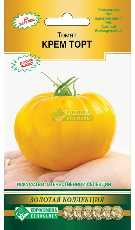 Трудно найти человека, который бы не любил томаты. Один только вид блестящих красных, оранжевых, желтых, двухцветных томатов вызывает аппетит и поднимает настроение. Помидор в переводе с итальянского языка означает золотое яблоко. С точки зрения ботаники томаты — это ягоды, но их относят к фруктам. Ведь по ботанической классификации сочные плоды с семенами внутри, развивающиеся из цветка, являются фруктами. Помидоры вкусны и полезны! Крем Торт- среднеспелый, салатный сорт для выращивания в плёночных теплицах и под временными плёночными укрытиями в ЛПХ. Растение индетерминантного типа. Лист средней длины, тёмно-зелёной окраски. Соцветие сложное. Плодоножка с сочленением. Плод плоскоокруглой формы, мягкий, средне ребристый. Окраска незрелого плода светло-зелёная без пятна у плодоножки, зрелого - жёлтая. Число гнезд - более 6. Масса плода - 350 г. Вкус хороший. Урожайность товарных плодов в поликарбонатных теплицах составила 19,0-19,3 кг/кв.м.