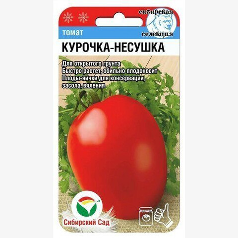 Для открытого грунта Быстро растет обильно плодоносит Плоды-яички для консервации засола вяления Ранний сорт для открытого грунта, из коллекции сибирских низкорослых обильно плодоносящих томатов. Растение компактное, высотой до 70 см, не требовательно к уходу, пасынкуется до первой кисти. В кисти 5-6 плотных, блестящих, ярко-красных плодов яйцевидной формы массой 90-140г. В плодах гармонично сочетается процентное содержание сахаров и характерной томатной кислинки. Томаты вкусны в свежем виде, но особенно хороши в засоле и консервации.