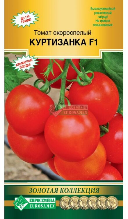 Трудно найти человека, который бы не любил томаты. Один только вид блестящих красных, оранжевых, желтых, двухцветных томатов вызывает аппетит и поднимает настроение. Помидоры вкусны и полезны! Куртизанка- высокоурожайный раннеспелый детерминантный гибрид. С момента полных всходов до первого сбора плодов проходит 90-95 дней. Растение слабооблиственное, высотой 50-70 см. Первое соцветие закладывается над 6-7 листом, последующие — через 1 лист. В каждой кисти завязывается по 6-10 очень красивых, выровненных, высокотоварных плодов. Томаты насыщенно-красного цвета, массой 90-110 г, округлой формы, с небольшим носиком. Плоды очень вкусные, ароматные, с легкой приятной кислинкой. Томаты подходят для свежего потребления и консервирования. Гибрид устойчив к вирусу мозаики томата (ToMV), фузариозному увяданию (Fol), кладоспориозу (Ff), альтернариозу (Asc), толерантен к фитофторозу (Pi). Растения не требуют пасынкования! Плотность посадки — 4 растения/м².